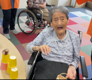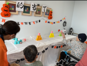 最後に「的当て」を利用者様にして頂きました。結果には関係なく中身は内緒ですが袋に包んだ景品をお渡しまています。普段なかなか見られない笑顔が見られて職員も大満足でした。