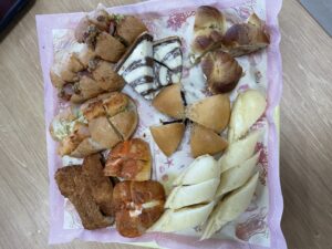 普段のメニューは和食ですが、時々洋食もあります。今回の昼食は洋食で、パンバイキングです。色々なパンを用意しました。並んだたくさんのパン中からご入居者様が好きな物を自由に選べます。「どれにしようかな」と目を輝かせながらお好きなパンを選んで召し上がります。