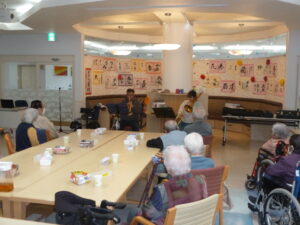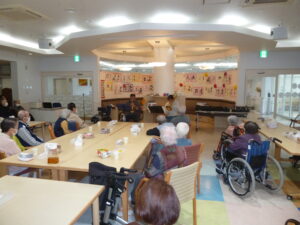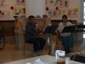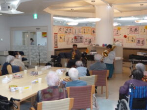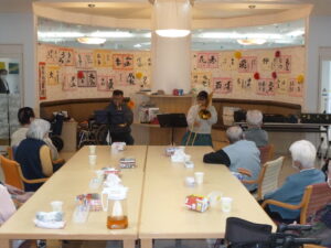 ボランティア「ちょもらんま」 デイサービス 11月17日(月)、今日はボランティア「ちょもらんま」の方々が来て下さいました。 トランペットとトロンボーンでとても迫力の演奏をしてくれました。 「幸せおみくじ」をひいておみくじに書かれている曲を演奏してくれるということで どんな曲があるのかハラハラドキドキでした。皆さん手拍子をしたり口ずさんたりしておられました。 目の前で演奏を聴くことができて、とても楽しい時間となりました。「ちょもらんま」の皆様ありがとうございました。 2025年11月17日