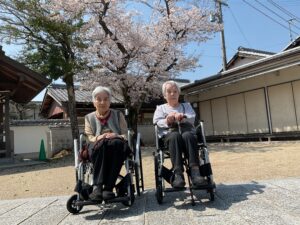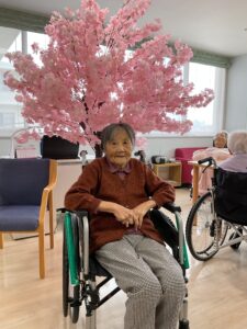 施設周辺の桜も満開となり、当フロアーではお花見レクリエーションを開催いたしました。晴れ渡る青空の下、満開の桜を眺めながら「今年も見られたね」と、皆様笑顔で春の訪れを感じていらっしゃいました。