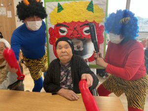 節分(5階) 特別養護老人ホーム5階 5階では2月は節分行事を行いました。 鬼のコスプレで職員が登場しフロアはすごく盛り上がっていました。 鬼を倒そうとされるご入居者様もおられました。 2026年03月13日