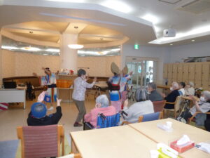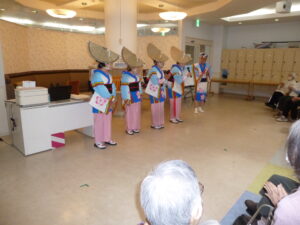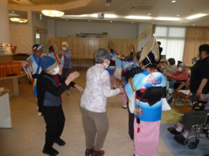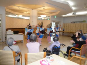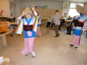 ボランティア「舞ふれんど」 デイサービス 令和8年4月23日(木) 今日は「舞ふれんど」の皆さんが来てくれました。 素敵な衣装で阿波踊りを踊ってくださいました。 一緒に輪になって踊ったり、カラオケの歌に合わせて踊ったりと、楽しい時間を過ごさせていただきました。 「舞ふれんど」の皆さんありがとうございました。 2026年04月27日